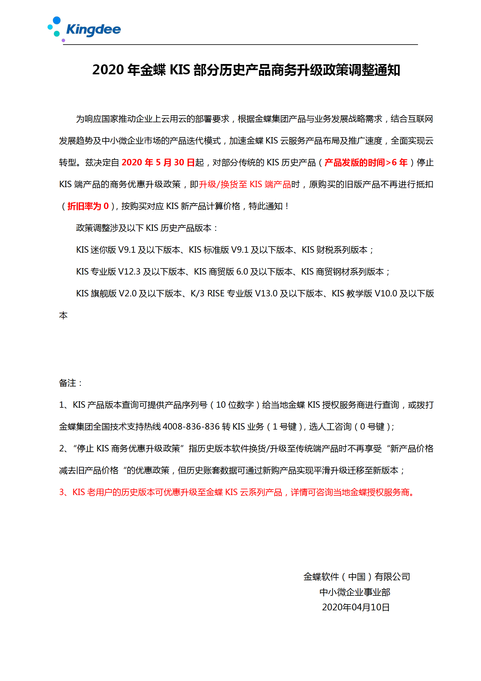 【公告】2020年(nián)金(jīn)蝶KIS部分(fēn)曆史産♥↑§<品商務升級政策調整通(tōng)知(zhī)