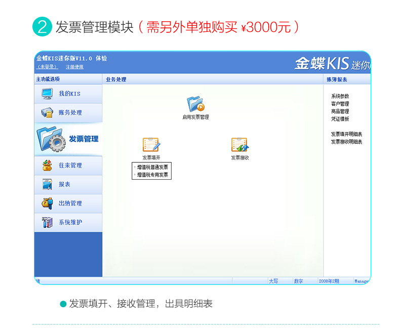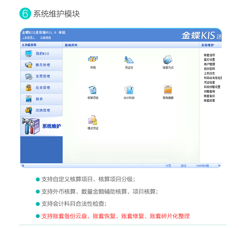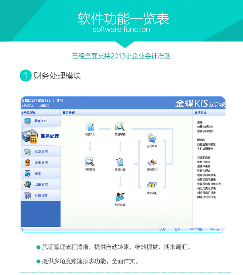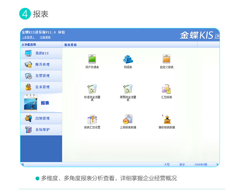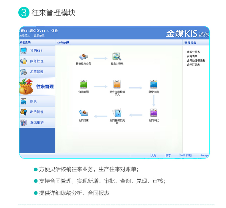 金(jīn)蝶KIS 迷你(nǐ)版V12.0,功能(né★↓<ng)包括:賬務處理(lǐ)、往來(lái)管理(lǐ)、報(bào)表、出納管↕ 理(lǐ)。