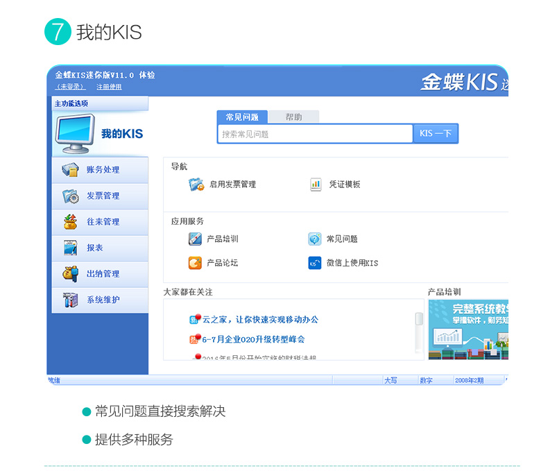 金(jīn)蝶KIS 迷你(nǐ)版是(shì)專門(mén≥∏↑↑)針對(duì)創業(yè)型企業(yè)簡單财務核算(suàn)及管≥♦<理(lǐ)工(gōng)作(zuò)的(de)信息化(huà)解決方案,通(tōng)過對(duì)企業(yè)日(rì)常賬務、發票(pi☆≤¥↑ào)及往來(lái)資金(jīn)的(de)管理(lǐ),規範企業(yè)财務核算(suàn∞ <),幫助企業(yè)解決手工(gōng)财務核算(suàn)混亂δ→π和(hé)财務數(shù)據不(bù)及時(shí)的(de)問(λ&>πwèn)題。