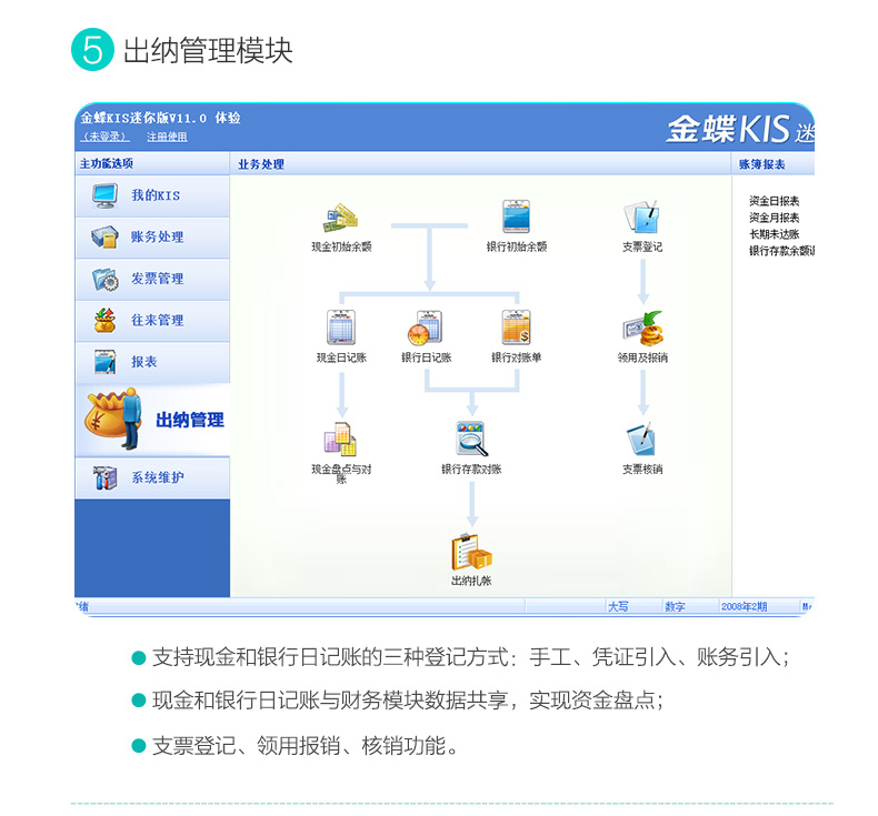 賬務處理(lǐ)、往來(lái)管理(lǐ)、出納、報(bào)表